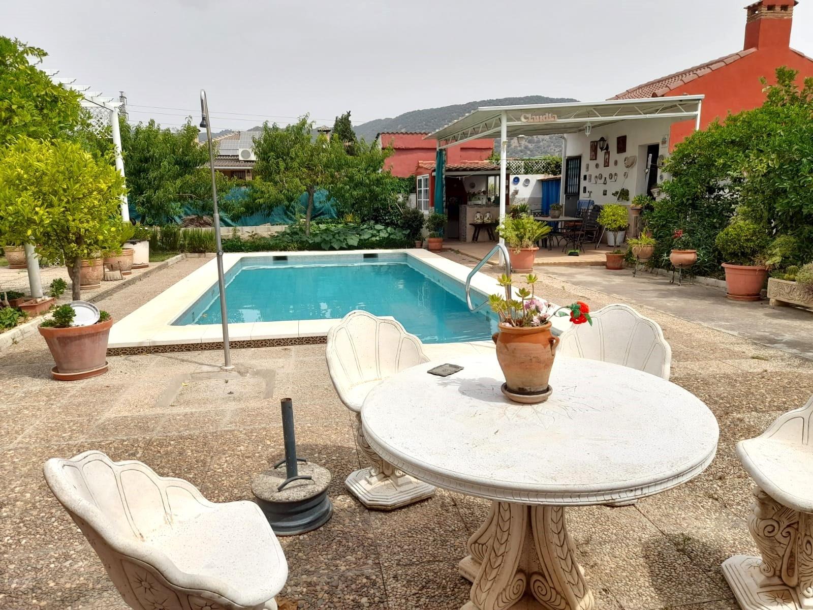 Se vende parcela de 1.000 metros aproximadamente de terreno con casa en planta baja con porche delantero y trasero distribuida en; salón con chimenea, cocina con salida a porche trasero, tres dormitorios y baño con placa de ducha. ~En el exterior dispone de aseo, piscina, garaje techado con capacidad para dos vehículos, zona de barbacoa, etc.~Calidades: Solados de plaqueta, carpintería exterior aluminio blanco, carpintería interior madera, Split en salón y cocina, agua de pozo artesano, exteriores hormigonado, arboles frutales. Ideal para disfrutar en familia y al aire libre.~~~ El precio de la vivienda publicitada no incluye los gastos de compra venta. En cumplimiento del articulo 5º del decreto 21805 de 11 de Octubre en el que se aprueba el reglamento de información al consumidor en la compraventa de vivienda en Andalucía Joaquin Gestión Inmobiliaria S.L informa: ~ ~Gastos independientes al precio de venta: ~Impuesto de Transmisiones Patrimoniales – Notaria y Registro – Honorarios de Agencia Inmobiliaria. ~Joaquin Gestión Inmobiliaria S.L pone a disposición del consumidor documento Informativo abreviado (D.I.A) en cualquiera de su oficina situada en Avenida de Jesús Rescatado nº 1.~~~~